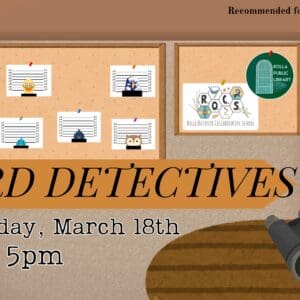 Bird Detectives with ROCS Come join us at the Rolla Public Library on March 18 from 4-5 pm to solve the toughest case of […] 18 Mar 4:00 pm - 5:00 pm Rolla Public Library 900 North Pine Street, Rolla, Mo 65401