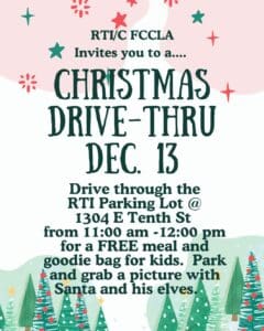 RTI, RTC & FCCLA invites you to a Christmas Drive Thru on December 13! Drive through the RTI Parking Lot from 11 am to 12 pm for a free meal and goodie bag for kids. There will also be pictures with Santa and his elves!