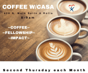 Join CASA the 2nd Thursday of each month for coffee and networking! Stop by on August 14 from 8-9 am for coffee, fellowship, and learning how you can make an impact.
