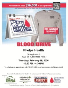 The next community blood drive will take place on February 19 from 10:30 am to 4:30 pm at Phelps Health in Dining room 2. To schedule an appointment please call 417-227-5006 or go to www.cbco.org/donate-blood