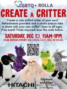 Join LGBTQ+ on Saturday, December 13th at 11am for our Create-a-Critter holiday DIY stuffed animal event! They’ll be gathering at the Eugene Northern Community Hall – 400 W 4th Street, Rolla MO.