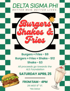 Join Delta Sigma Phi for their annual Burgers, Fries & Shakes fundraiser on April 25 from 11 am to 4 pm at 215 West 8th St. All proceeds for this fundraiser go to the ALS foundation.