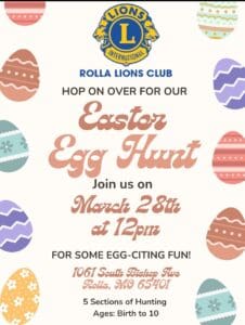 The Rolla Lions Club easter egg hunt will take place on March 28 at 12 pm in the park! There will be 5 different sections of egg hunts. Ages 0-10 are welcome to attend. Come out for some family fun in the park!