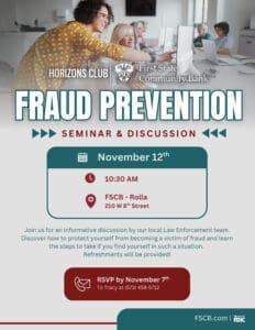 Join the FSCB Horizons Club on November 12 at 10:30 am for a seminar/discussion on fraud prevention. The seminar will be led by local law enforcement and will teach you tips on how to protect yourself from becoming a victim of fraud and learn the steps to take if you find yourself in a situation. Refreshments will be provided. Please RSVP to Tracy at 573-458-5712 by Novmeber 7.
