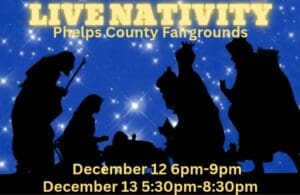 The Phelps County Fairgrounds will host their annual live nativity scene on December 12 from 6-9 pm and again on December 13 from 5:30 – 8:30 pm!