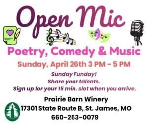 Join Prairie Barn Winery on Sunday, April 26 from 3-5 pm for their open mic night! You can come out to watch or sign up for your 15 minute slot when you arrive. Call 660-253-0079 for more information