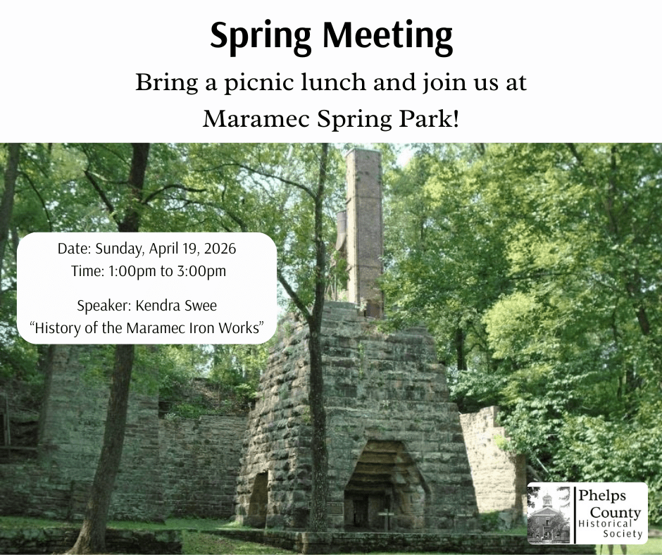 Join us as we open a new season at the Phelps County Historical Society on April 19 starting at 1 pm. Our Spring Meeting will be a picnic lunch (bring your own) out at the beautiful Maramec Spring Park. We will be meeting at the Warren Shelter right by the river.