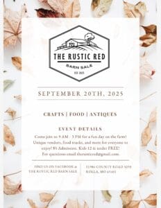 Come out to the Rustic Red Barn to enjoy a full day of shopping on September 20 from 9am to 3 pm located at 11986 County Road 3250 Rolla, MO 65401! This is the first sale at The Rustic Red Barn, so come out and see what amazing vendors they have set up!