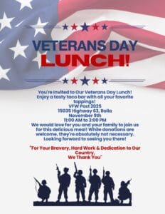 The VFW Post 2025 invites all veterans and guests to join them on November 9 from 11 am – 3 pm for a free lunch to honor you and your sacrafices. See flyer below for more information.