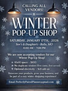 Calling all vendors! There will be a winter pop up shop on Saturday, January 17 from 11 am – 7 pm at Sons and Daughters Venue in Rolla!