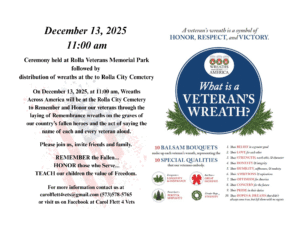 On Saturday, December 13 at 11:00 a.m., Wreaths Across America will be held in Rolla. The day will begin with a ceremony at Rolla Veterans Memorial Park, followed by the laying of remembrance wreaths at Rolla City Cemetery. This annual tradition is a time to remember and honor our nation’s veterans by placing wreaths on the graves of our country’s fallen heroes and speaking each veteran’s name aloud so their legacy is never forgotten.